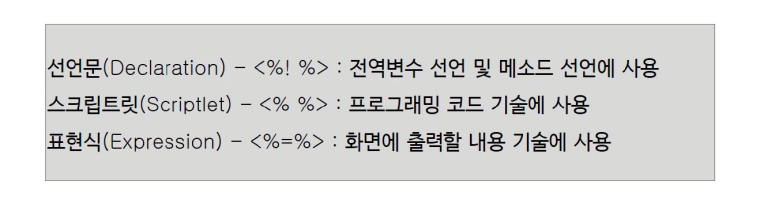 - JSP 페이지에서는 선언문(Declaration), 스크립트릿(Scriptlet), 표현식(Expression) 이라는 3가지의 스크립트 요소를 제공