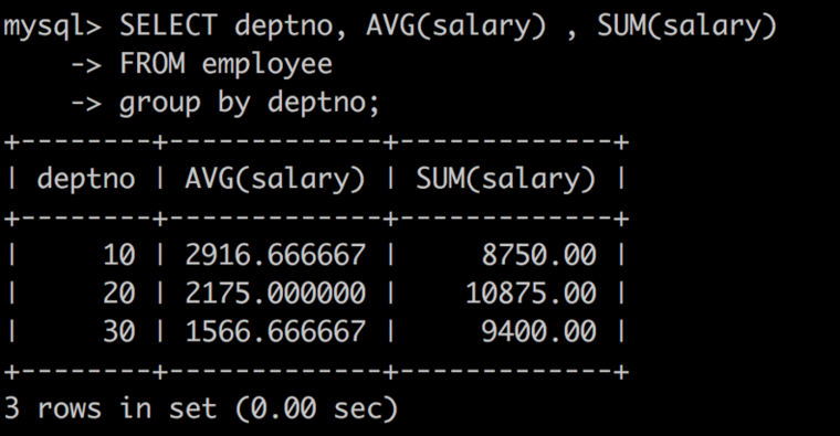 SELECT deptno, AVG(salary) , SUM(salary) FROM employee group by deptno;