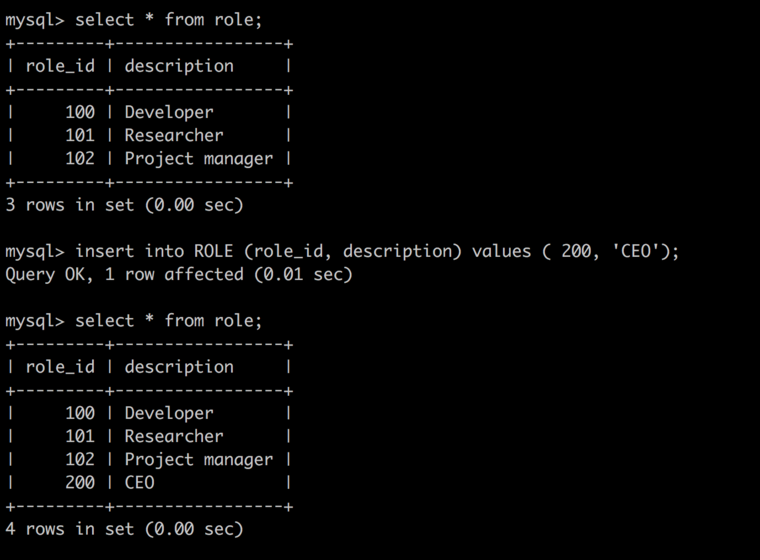 예제 : ROLE테이블에 role_id는 200, description에는 'CEO'로 한건의 데이터를 저장하시오.