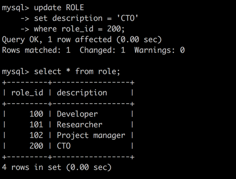 예제 : ROLE테이블에 role_id가 200일 경우 description을 'CTO'로 수정하시오.