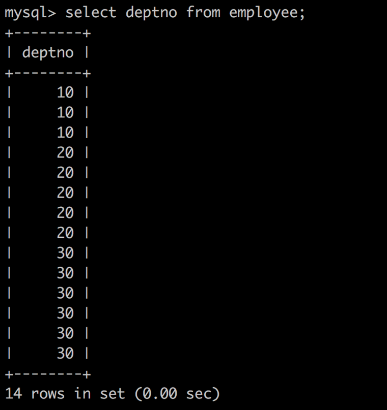 예제1 : 사원 테이블의 모든 부서번호 출력하시오. (사원 수 만큼 출력된다.)