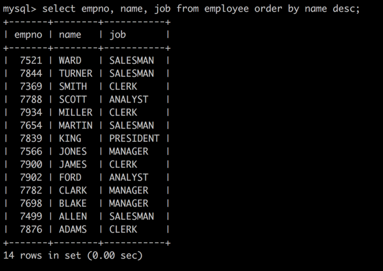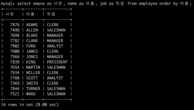 select empno, name, job from employee order by name; select empno as 사번, name as 이름, job as 직업 from employee order by 이름;
